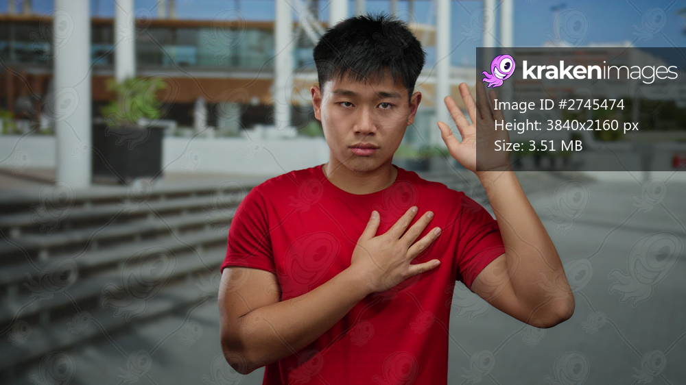 Young chinese man standing on a city street in an outdoor urban setting wearing a red shirt with one hand on his chest and the other raised in front of modern architecture. - Kraken Images