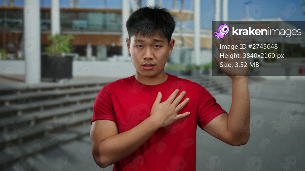 Young chinese man standing on a city street in an outdoor urban setting wearing a red shirt with one hand on his chest and the other raised in front of modern architecture. - Kraken Images