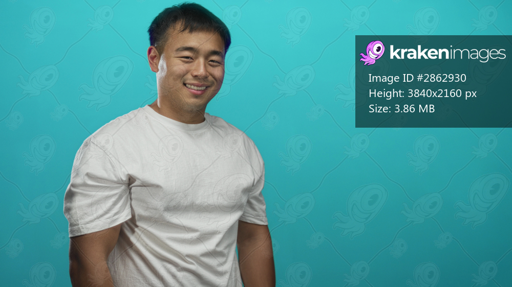 Young chinese man stands smiling in studio wearing white tee shirt against turquoise wall; confidence optimism determination.