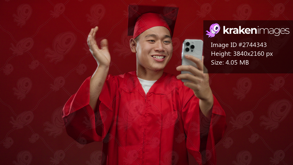 Young chinese man student in red graduation gown making a video call on smartphone over isolated red wall celebrating academic achievement with a joyful expression. - Kraken Images