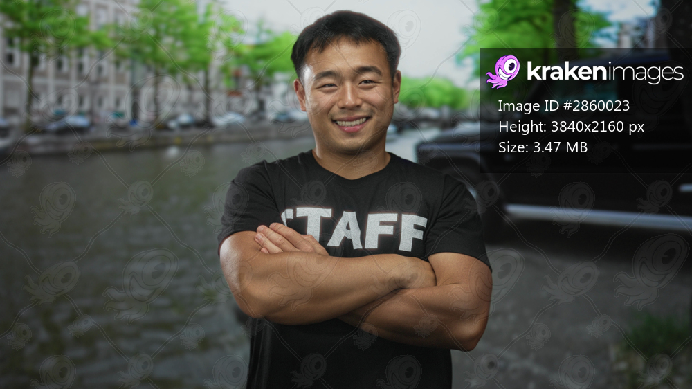 Young chinese man wearing black staff shirt crossing arms along a city canal street next to a parked suv and lush tree lined bank; confidence.
