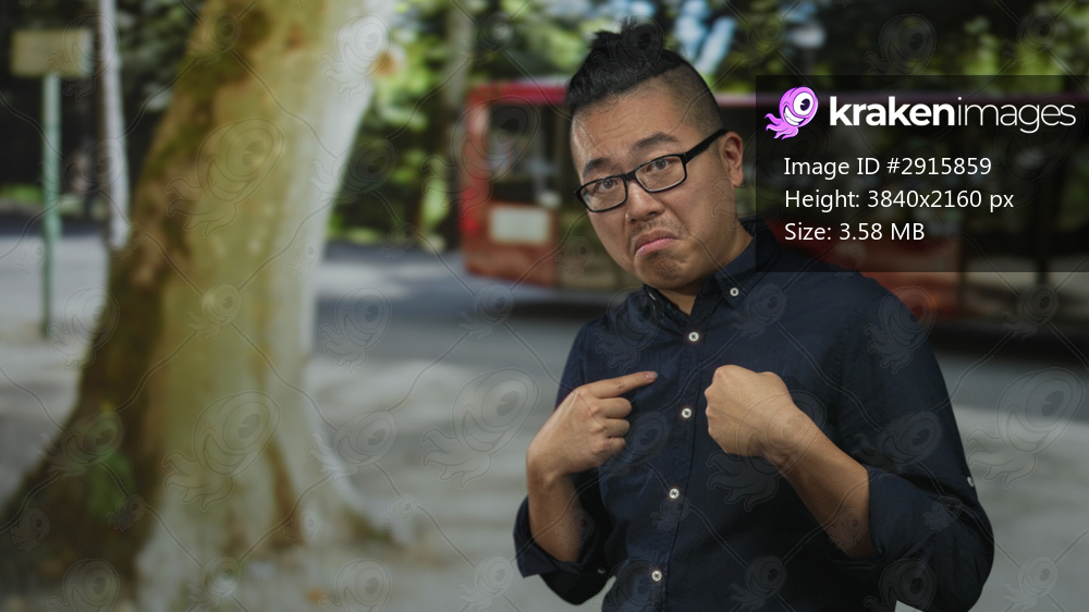 Young chinese man wearing glasses and a navy shirt points finger to his chest on a tree lined city street beside a bus stop and red bus; self doubt.