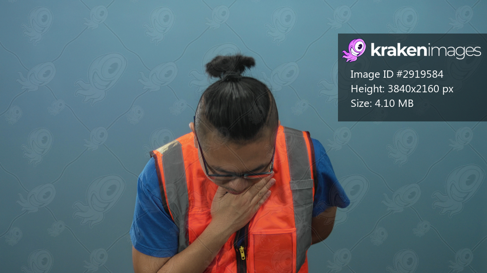 Young chinese man wearing glasses and an orange reflective vest with hand pressed to chest in a blue studio; respect duty.