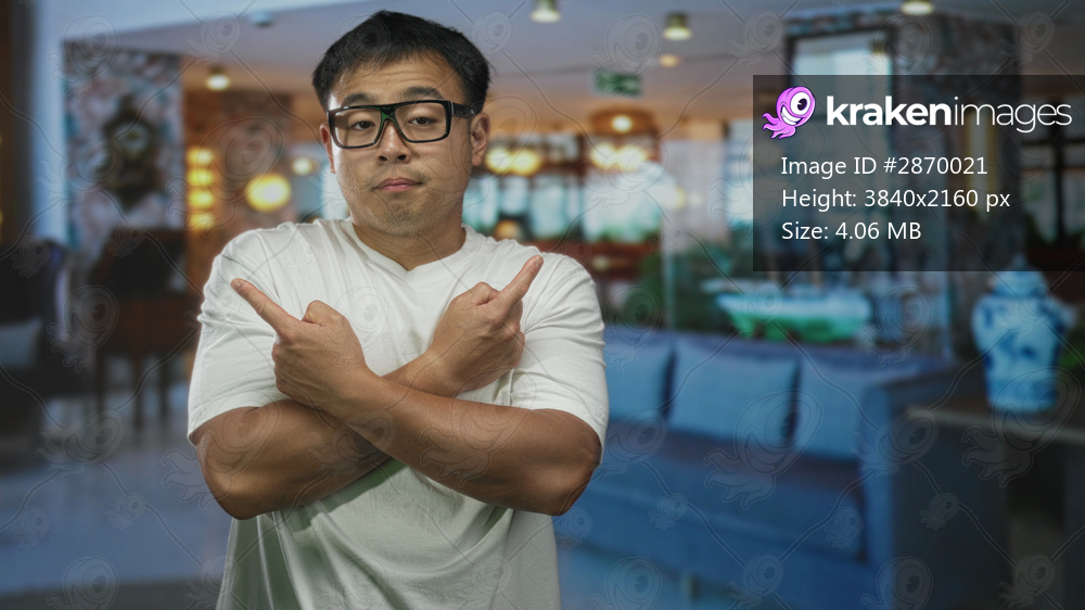 Young chinese man wearing glasses finger pointing to left in hotel lobby; uncertainty hesitation doubt indecision.