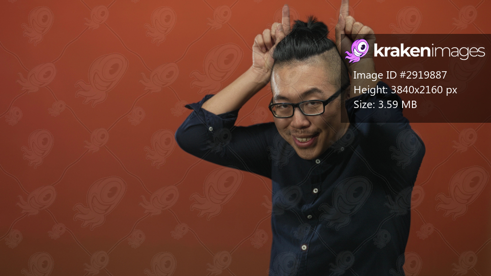 Young chinese man wearing glasses and navy shirt making horns with fingers and smiling in studio against orange backdrop; playful mischief.