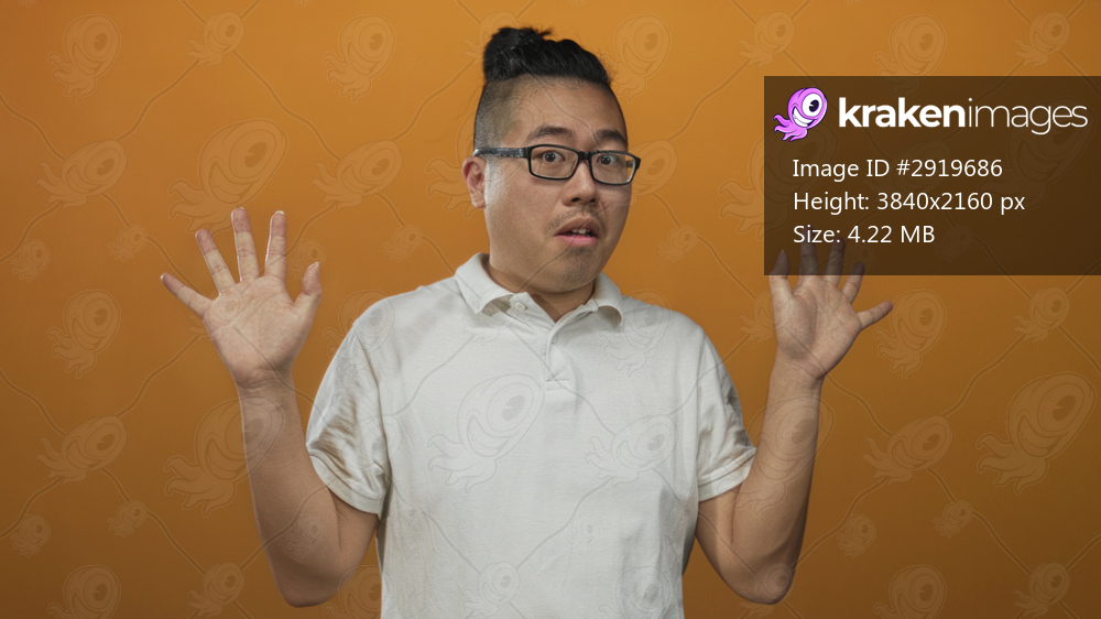 Young chinese man wearing glasses and white polo shirt, hands raised showing palms in studio with orange backdrop; surprise.