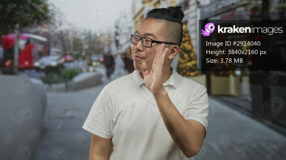Young chinese man wearing glasses and white polo shirt waves hand near a storefront and decorated christmas tree on a busy city street; friendliness.