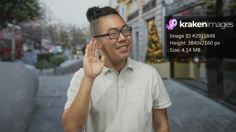 Young chinese man wearing glasses and white polo shirt waves hand near a storefront and decorated christmas tree on a busy city street; friendliness.