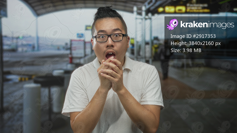 Young chinese man wearing white polo and glasses, hands covering mouth in airport terminal outdoors; surprise.