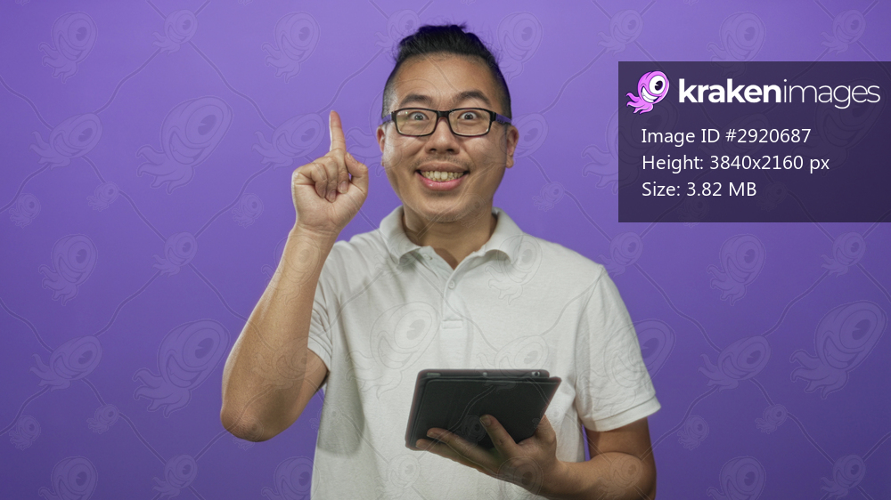 Young chinese man wearing white polo and glasses holding tablet and pointing finger in purple studio; enthusiastic learning.