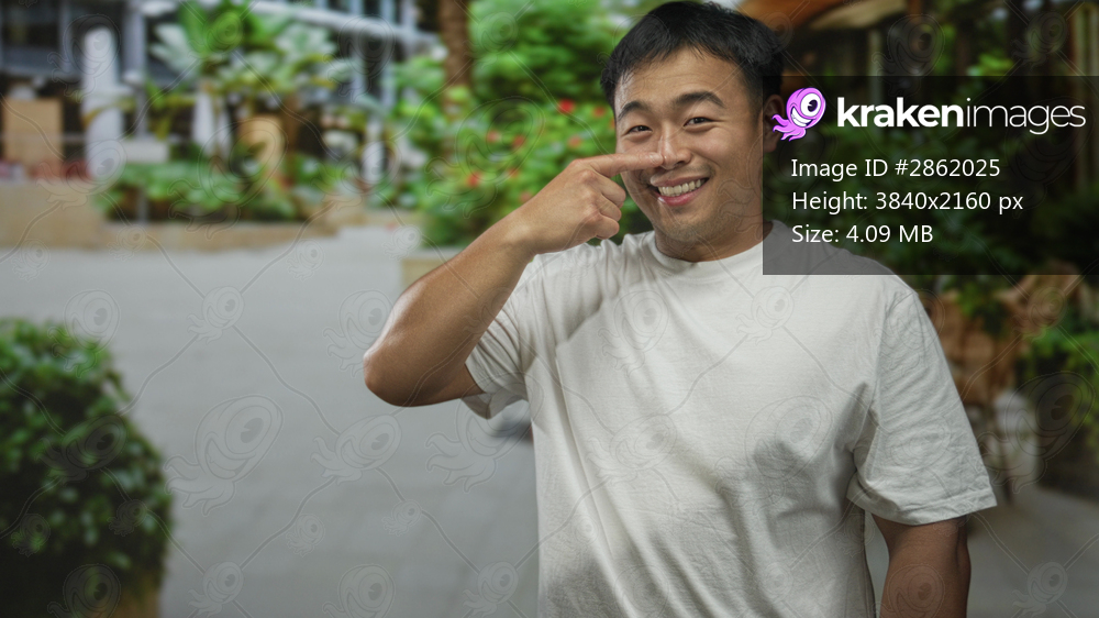 Young chinese man wearing white shirt smiles and points finger to nose on street; playfulness humor whimsy curiosity.