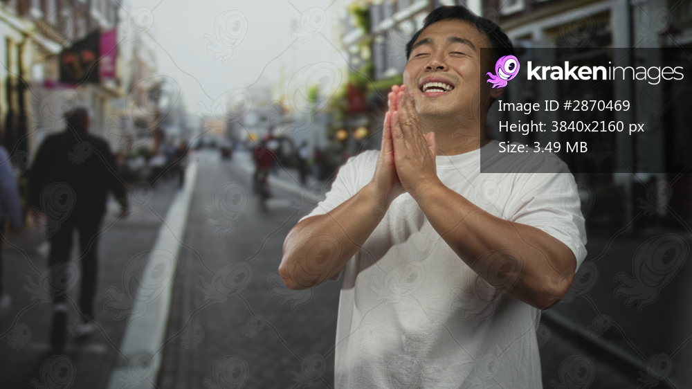 Young chinese man wearing white shirt smiling with clasped hands on a busy city street lined with shops at dusk; gratitude.