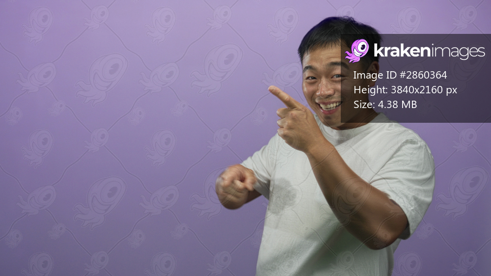Young chinese man wearing white tshirt smiles and points finger to right in purple studio; cheerfulness.