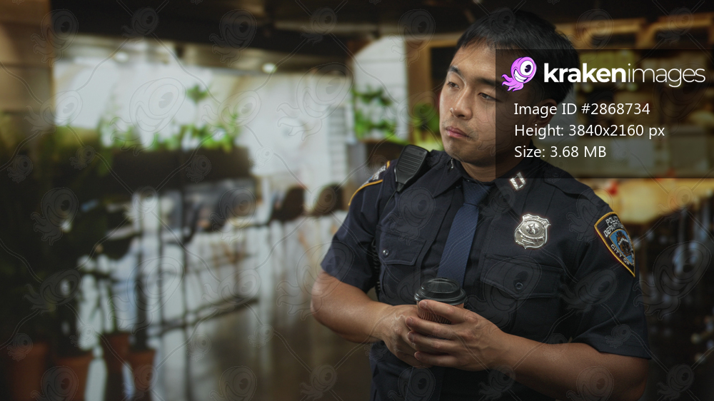 Young chinese policeman holds coffee cup and tilts head thoughtfully in restaurant; contemplation duty.