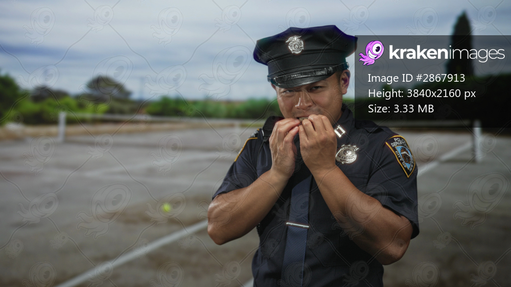 Young chinese policeman in navy uniform biting nails by tennis court fence on street outdoors; nervous tension.
