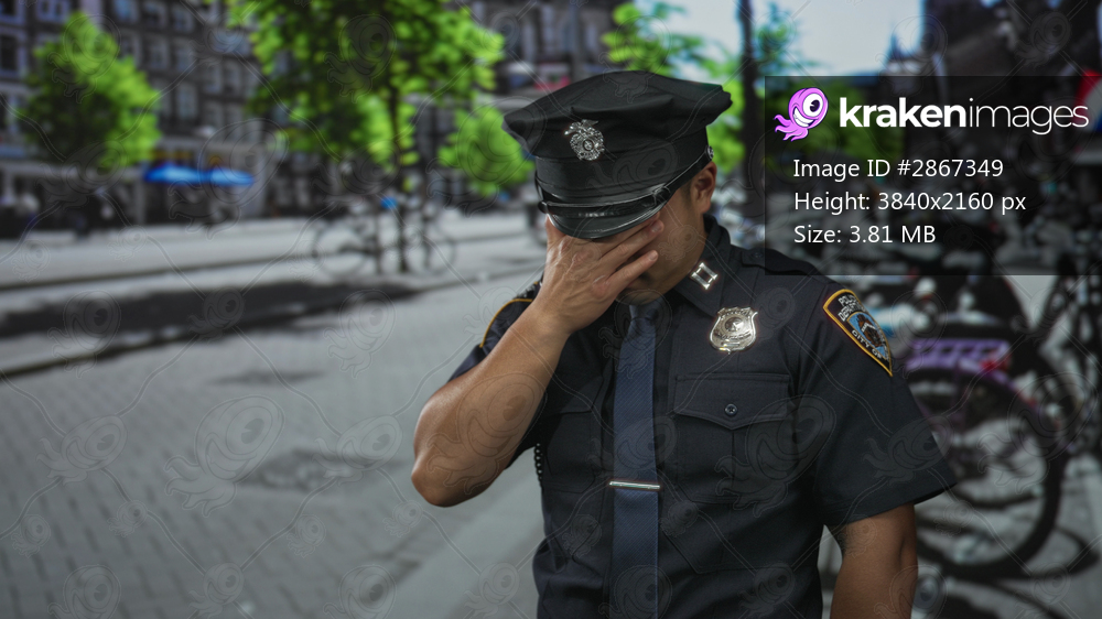 Young chinese policeman in navy uniform covers his face with his hand beside a row of bicycles on a busy city street; frustration.