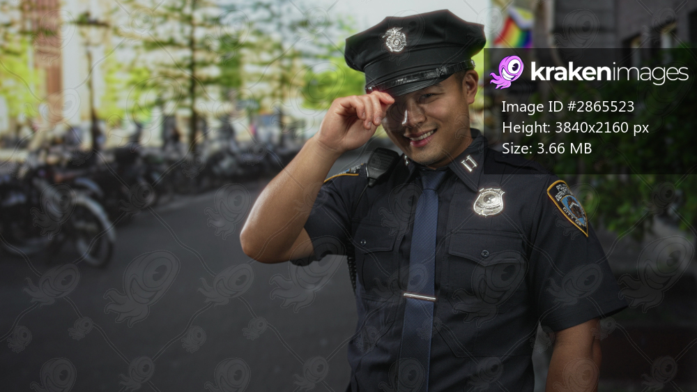 Young chinese policeman in navy uniform tips hat with hand on busy city street under bright sunlight; duty.