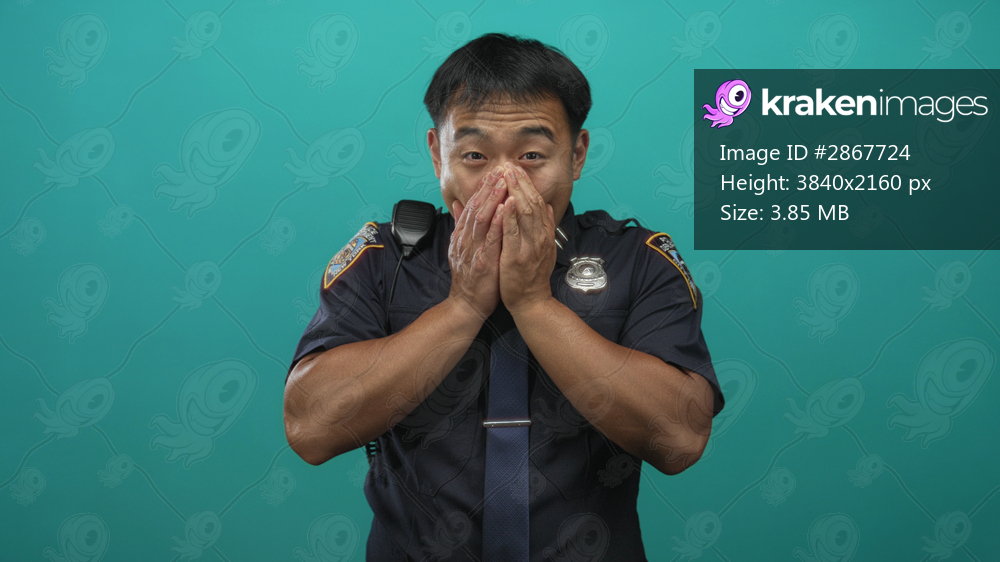 Young chinese policeman in teal studio covers mouth with hands pressed to face; surprise vulnerability uncertainty.