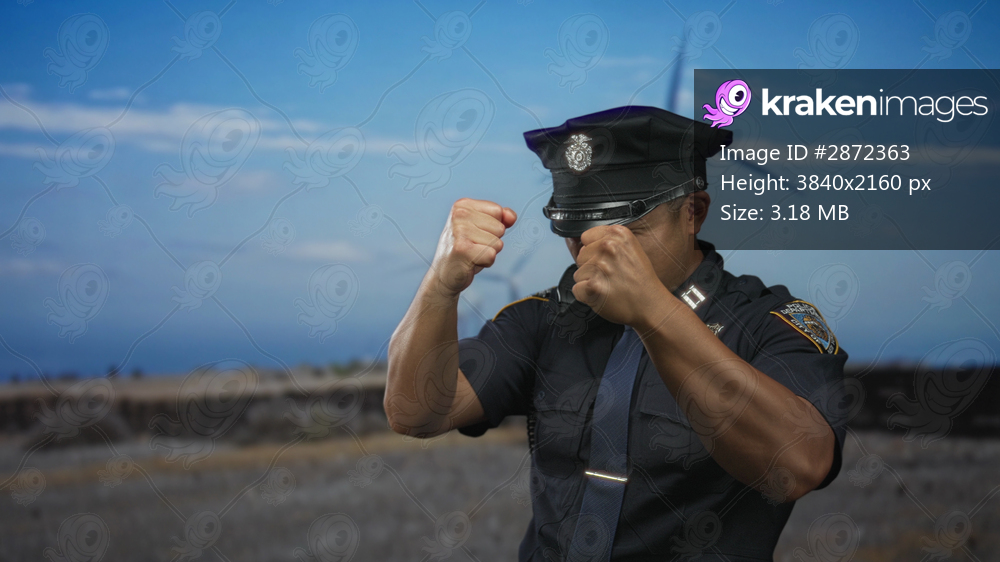 Young chinese policeman in uniform raises clenched fists beside a windmill building under clear blue sky; determination.