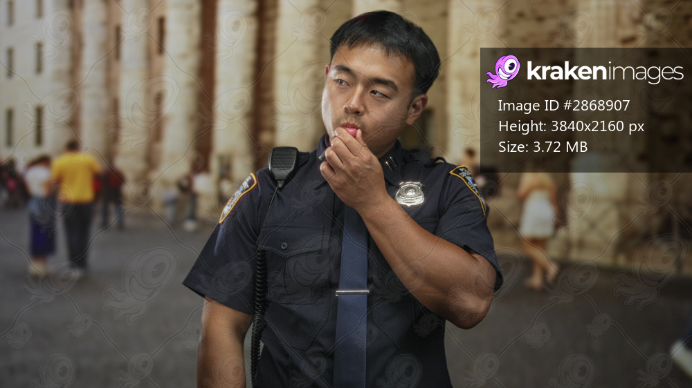 Young chinese policeman touching chin in pensive pose on crowded old street by stone building; reflection.