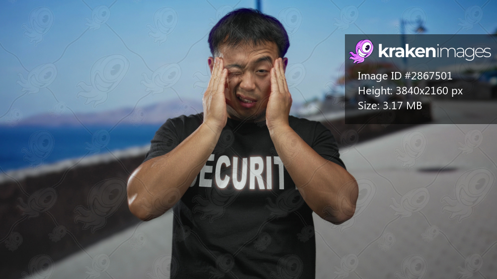 Young chinese security guard wearing a black shirt pressing both hands to temples on a seaside street promenade; stress.