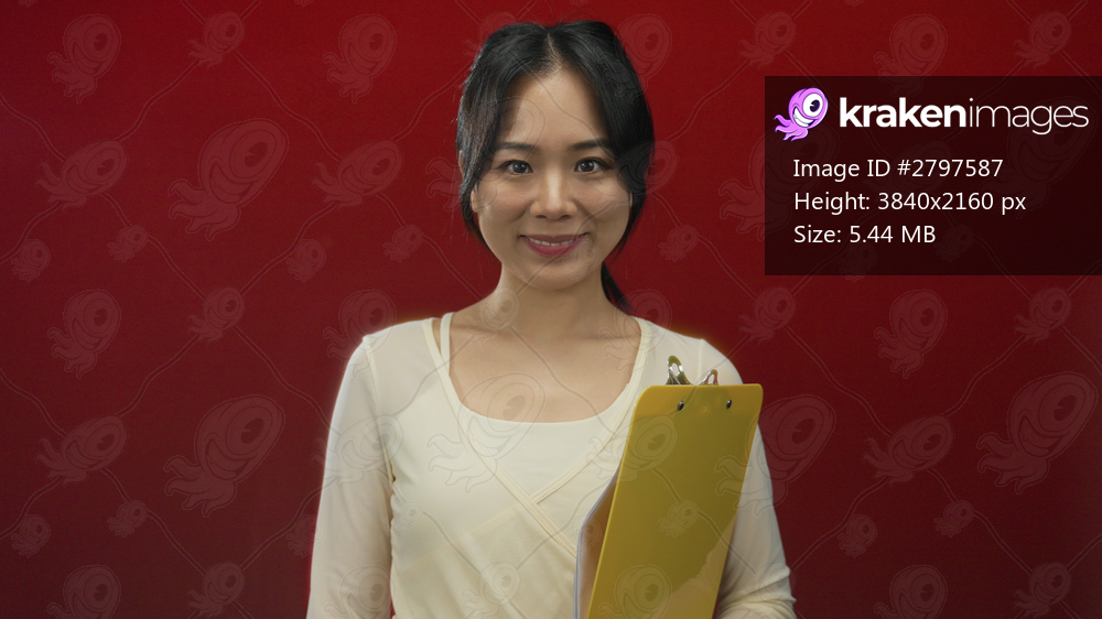 Young chinese woman with a clipboard makes a welcoming gesture against a vibrant red background, her expression engaging and friendly.