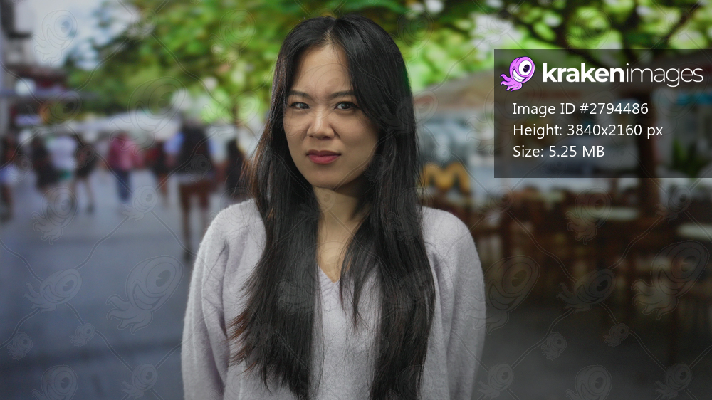 Young chinese woman with a pensive expression standing on a bustling street terrace, surrounded by people and greenery, creating a vibrant and lively outdoor scene. - Kraken Images