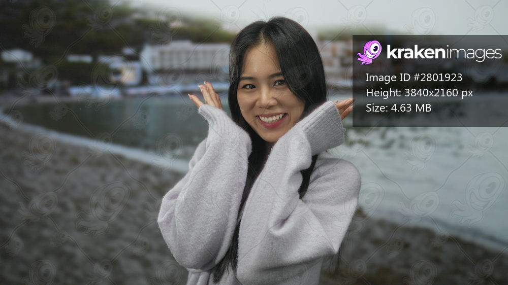 Young chinese woman at the seaside smiling in a cozy sweater with hands playfully covering face, capturing a joyful moment of relaxation at the beach.