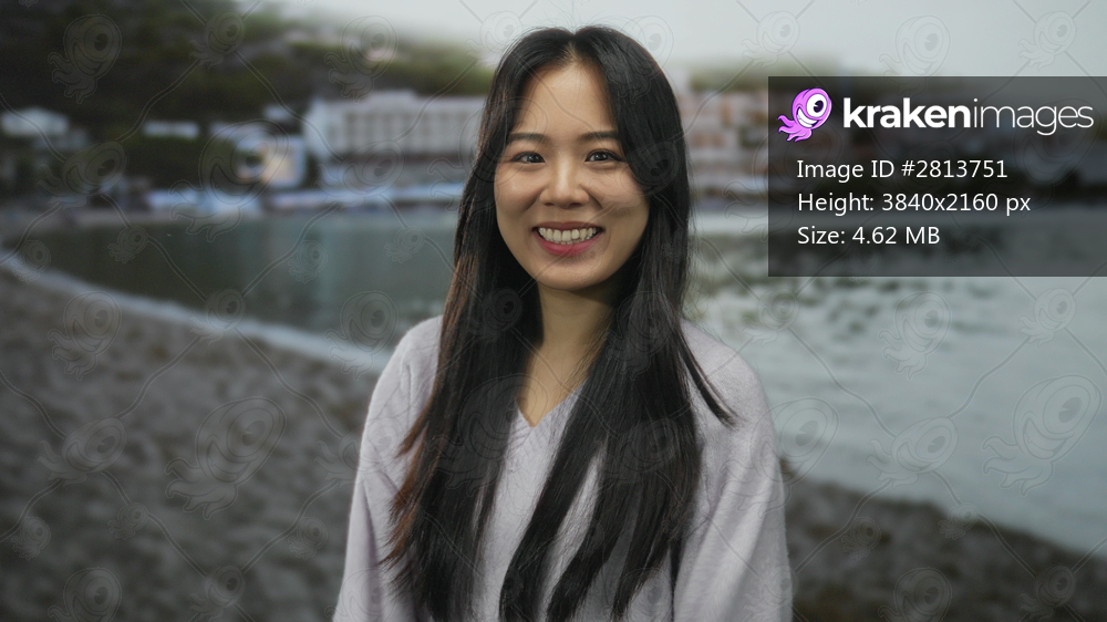 Young chinese woman at the seaside smiling in a cozy sweater with hands playfully covering face, capturing a joyful moment of relaxation at the beach.