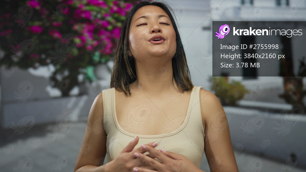 Young chinese woman breathing deeply outdoors in a city street surrounded by vibrant flowers and white buildings, captured in a serene moment of mindfulness and tranquility. - Kraken Images