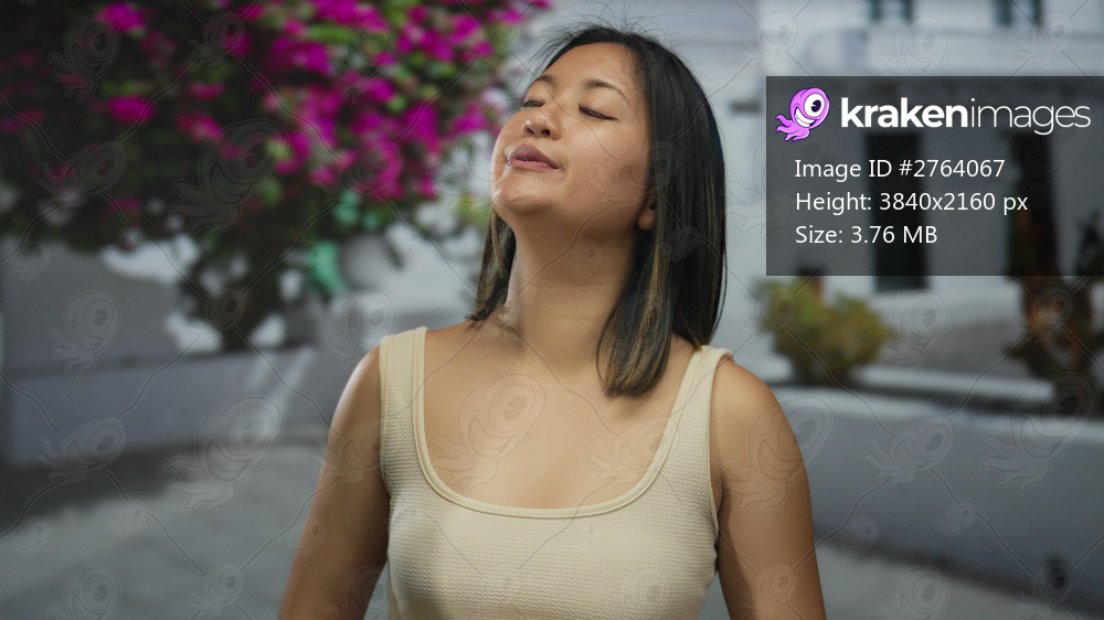 Young chinese woman breathing deeply outdoors in a city street surrounded by vibrant flowers and white buildings, captured in a serene moment of mindfulness and tranquility. - Kraken Images
