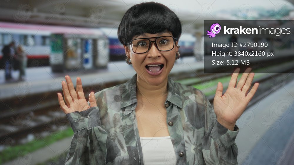 Young chinese woman clapping at an outdoor train station, wearing glasses and a floral jacket, expressing excitement with trains visible in the background. - Kraken Images