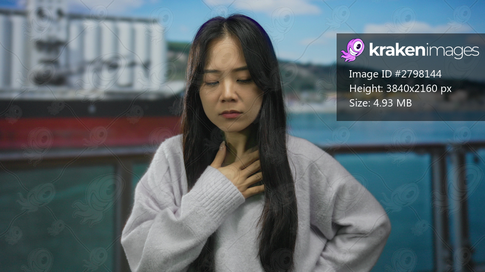 Young chinese woman coughing on a seaside cruise boat with blurred sea and ship in the background, capturing an outdoor health concern in a travel setting. - Kraken Images