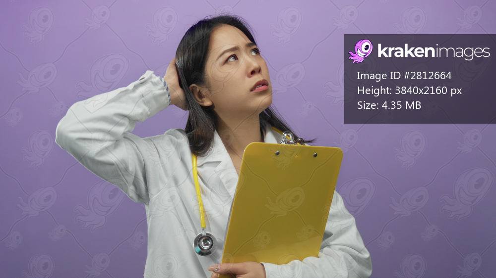 Young chinese woman doctor in uniform with stethoscope and clipboard looks puzzled against isolated purple background.