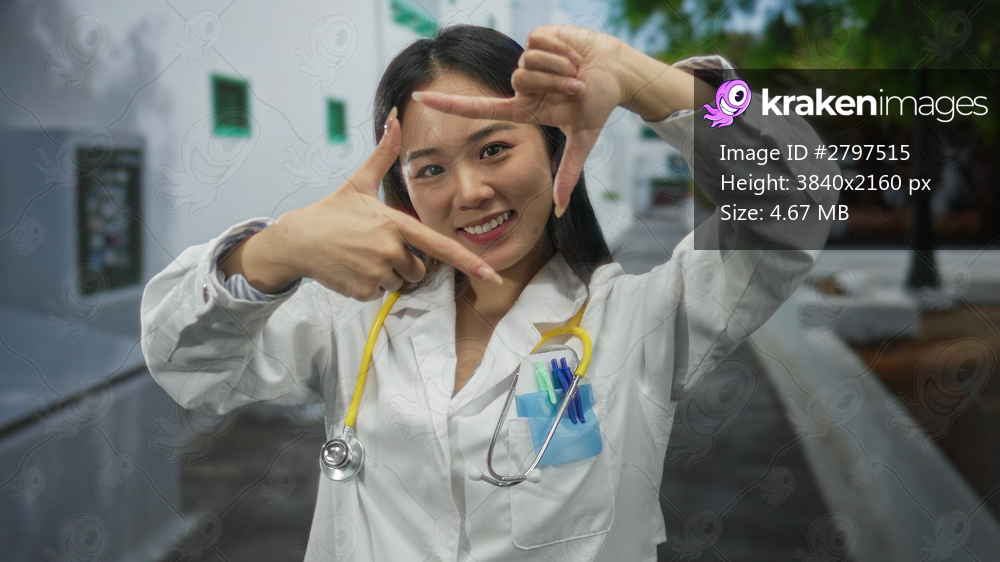 Young chinese woman doctor in uniform with stethoscope outdoors making hand frame gesture on street.