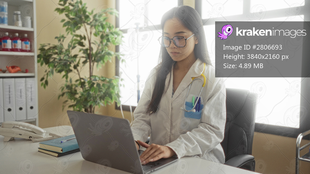 Young chinese woman doctor in uniform using a laptop in a clinic room, holding her shoulder with a stethoscope draped around her neck, conveying a sense of workplace strain. - Kraken Images