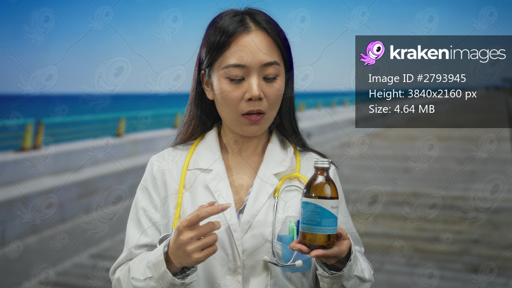 Young chinese woman doctor with stethoscope holding medication outdoors on a seaside promenade.
