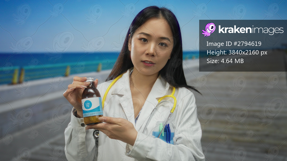 Young chinese woman doctor with stethoscope holding medication outdoors on a seaside promenade.
