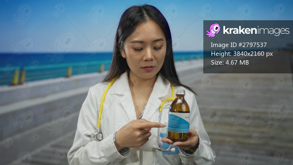 Young chinese woman doctor with stethoscope holding medication outdoors on a seaside promenade.