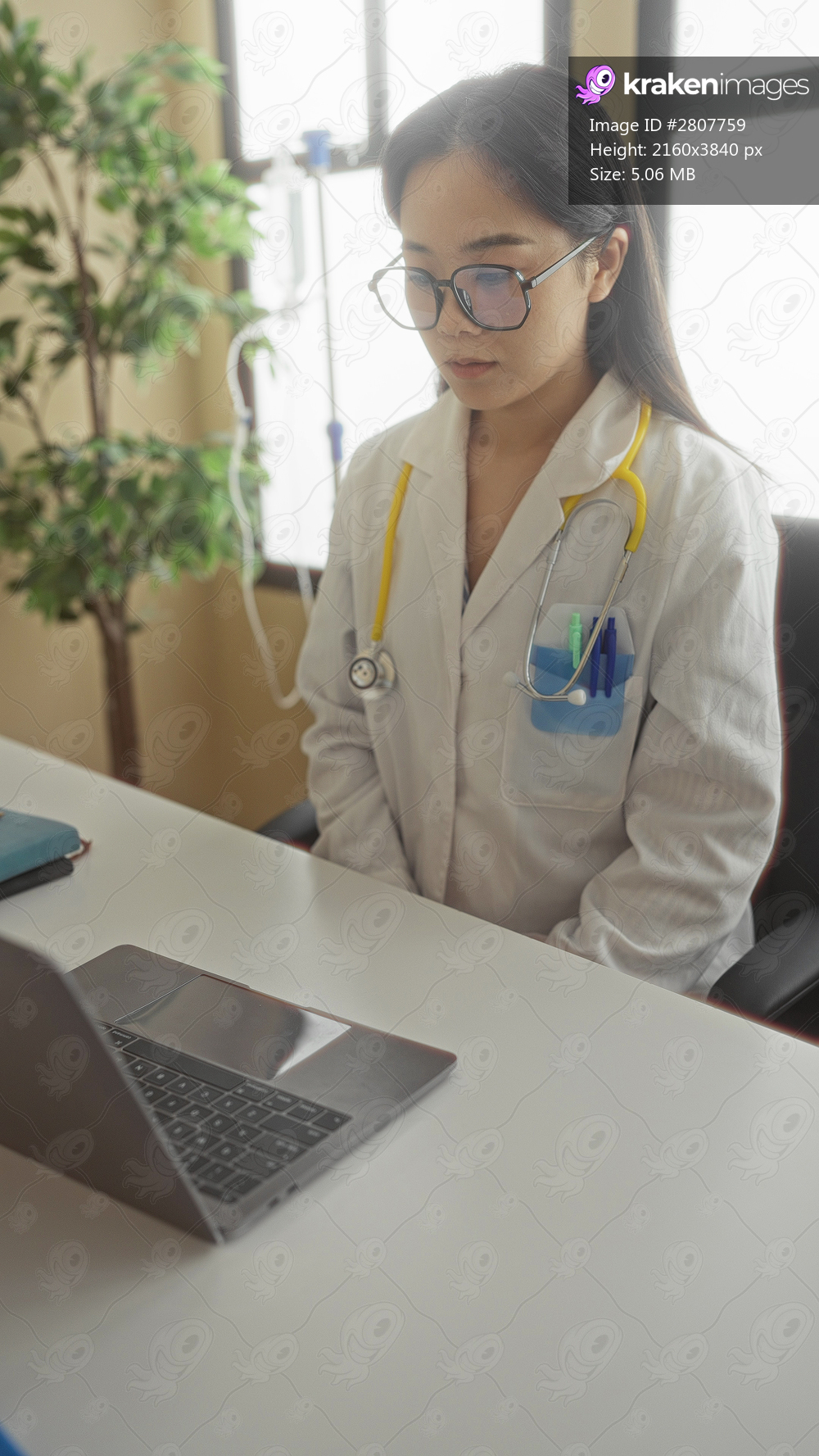 Young chinese woman doctor wearing uniform with stethoscope, focused on a laptop in a bright clinic room, emphasizing a professional healthcare environment. - Kraken Images