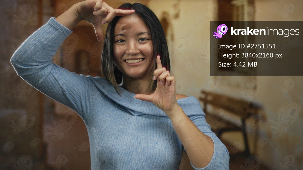 Young chinese woman framing her face with hands, smiling indoors at an old university setting featuring arches and benches.