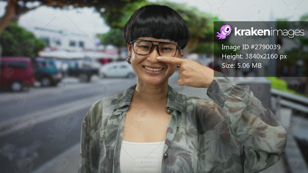 Young chinese woman gesturing on a bustling city street, wearing glasses and casual clothing, captures a moment of urban life and expression.