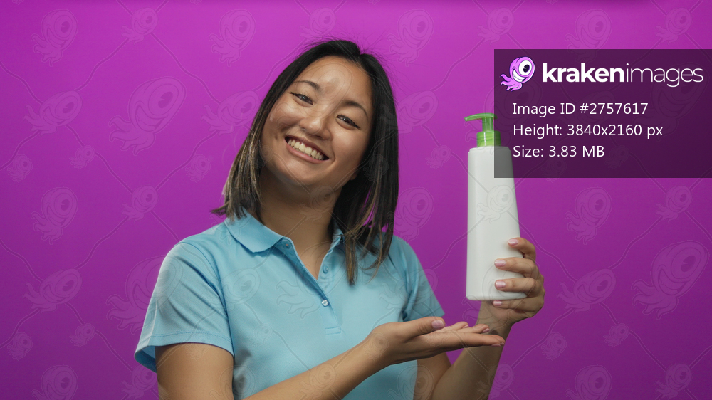 Young chinese woman holding a lotion bottle while smiling against an isolated pink background, showcasing personal care and skincare product with a vibrant and cheerful expression. - Kraken Images