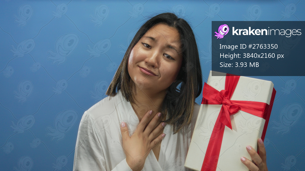 Young chinese woman holding gift box with red bow over blue background, expressing surprise and gratitude.