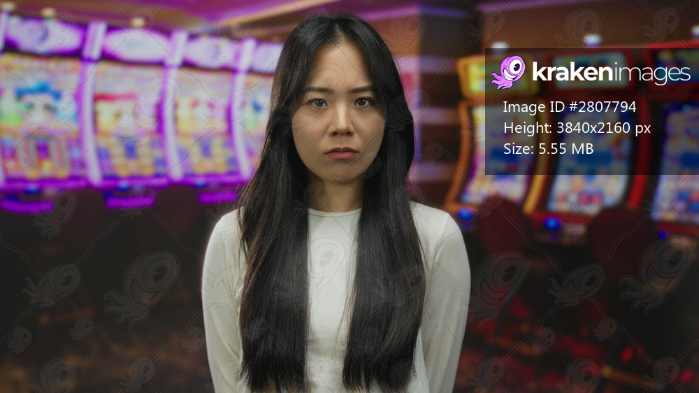 Young chinese woman in a casino setting stands indoors near colorful slot machines suggesting a captivating scenario of gaming and entertainment.