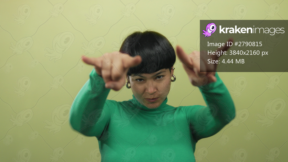 Young chinese woman in a green shirt makes a rock and roll gesture against an isolated yellow background, expressing fun and energy in a vibrant setting. - Kraken Images