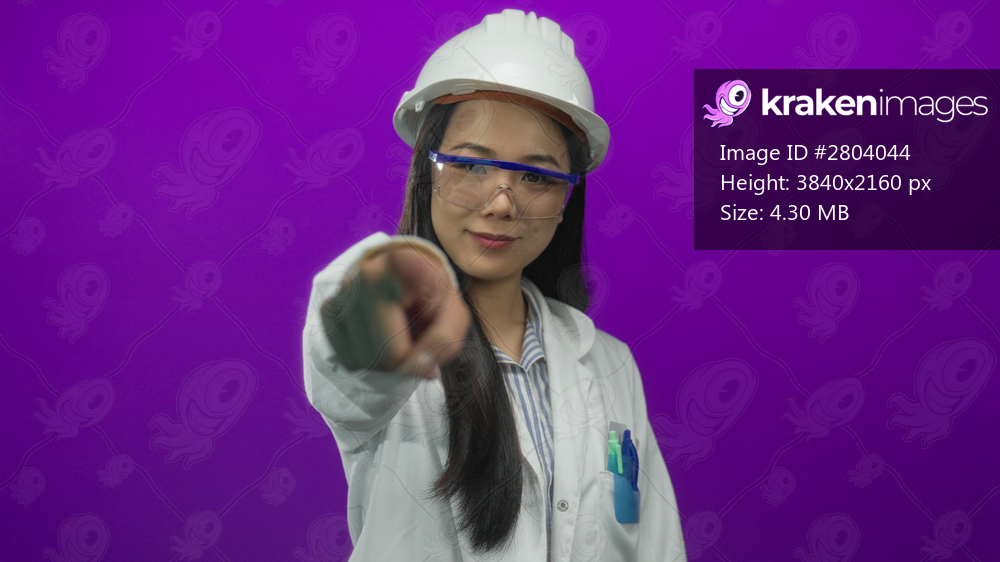 Young chinese woman in a hardhat and lab coat points forward against an isolated purple wall background, emphasizing her role in a professional or scientific setting. - Kraken Images