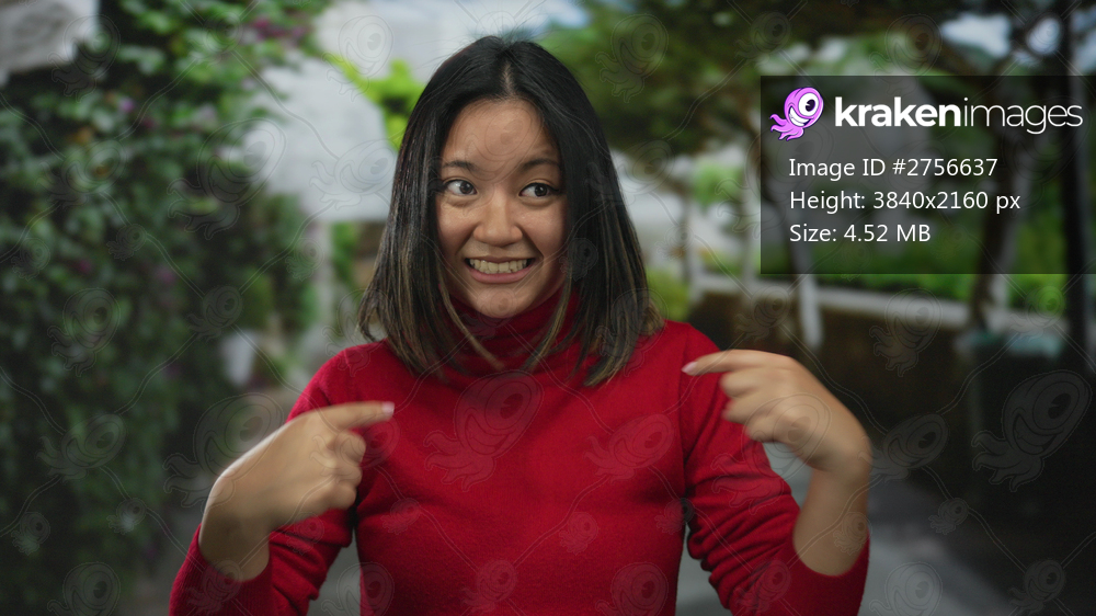 Young chinese woman in a red sweater smiling in a park pointing to herself with trees and bushes creating a vibrant outdoor setting.