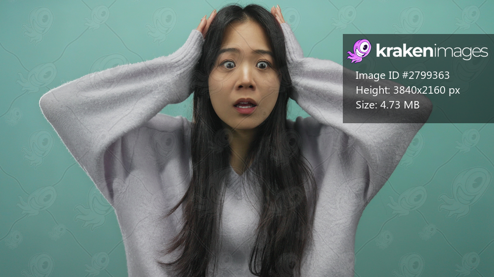 Young chinese woman in casual sweater posing anxiously with hands on head over isolated blue background wall.