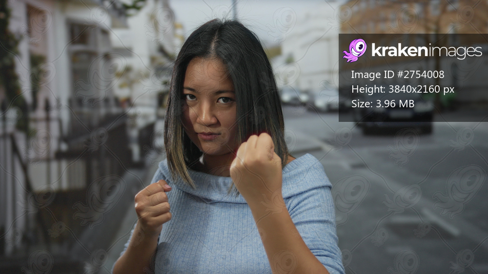 Young chinese woman in fighting stance on a vibrant city street, exuding strength and confidence amid urban surroundings with buildings and cars in the background. - Kraken Images